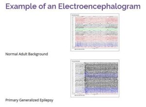 Παρακάτω βλέπουμε ένα ηλεκτροεγκεφαλογράφημα ενήλικα, φυσιολογικό και κατά τη διάρκεια επιληπτικής κρίσης. Παρατηρούμε ότι κατά τη διάρκεια της κρίσης φαίνεται πως τα νευρωνικά πρότυπα έχουν διαταραχθεί με αποτέλεσμα μια έκρηξη ηλεκτρικής δραστηριότητας.